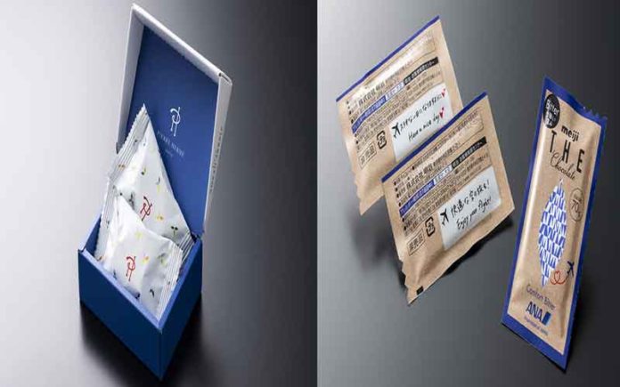 Cokelat yang diberikan adalah Meiji The Chocolate “Comfort Butter” yang merupakan merek lokal dan dibungkus khusus untuk maskapai. ANA mengatakan, cokelat ini terbuat dari biji kakao Venezuela premium yang telah dipanggang pada suhu tinggi untuk menghasilkan rasa yang kuat.