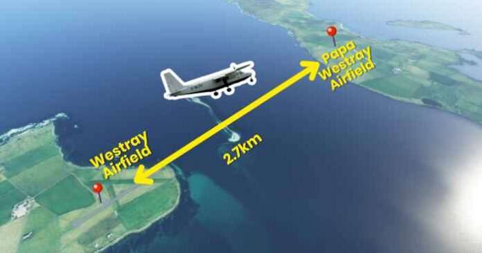 Penerbangan terjadwal terpendek tersebut menghubungkan dua pulau di Kepulauan Orkney, Skotlandia: Westray dan Papa Westray. Jarak antara kedua pulau ini hanya sekitar 2,7 km (1,7 mil), dan waktu terbang biasanya sekitar 90 detik, dengan rekor tercepat tercatat 53 detik.