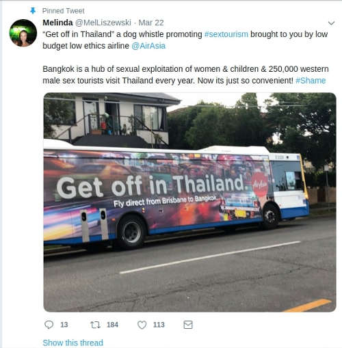 Pada caption cuitannya tersebut, Melinda mengatakan, “Get off in Thailand, promosi #sextourism yang dipersembahkan bagi Anda oleh maskapai berbiaya rendah @AirAsia. Bangkok merupakan pusat eksploitasi seksual terhadap wanita dan anak-anak, serta hampir 250.000 turis seks pria asal Barat mengunjungi Thailand setiap tahunnya. #Shame”