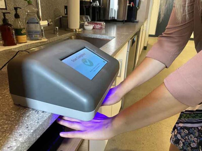 “Perangkat ini bekerja lewat gelombang cahaya tertentu untuk mencari kontaminasi mikroskopis di tangan Anda. Se-kecil apapun kontaminasi itu bersembunyi di bawah kuku jarimu, di antara perhiasanmu, di sela-sela jari tangan,” kata Christine Schindler, CEO PathSpot.