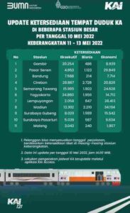 Informasi yang disebarkan melalui akun instagram @kai121_ terdapat stasiun – stasiun di Pulau Jawa dengan informasi ketersediaan tempat duduk mulai dari kelas eksekutif, bisnis, dan ekonomi. Tak hanya ketersediaan tempat duduk, rangkaian kereta api tambahan pun masih disediakan untuk antisipasi lonjakan penumpang saat semua kembali ke ibu kota.