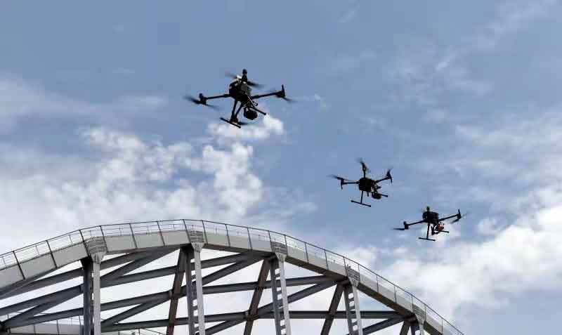 Tiga drone copter yang dilengkapi dengan sensor berpresisi tinggi berpatroli di sekitar jembatan kereta api untuk memeriksa struktur baja. Ketiganya berpatroli saat kereta berkecepatan tinggi dari Beijing menuju Shanghai melaju melintasi Jembatan Sungai Kuning Jinan, Provinsi Shandong, Cina Timur.