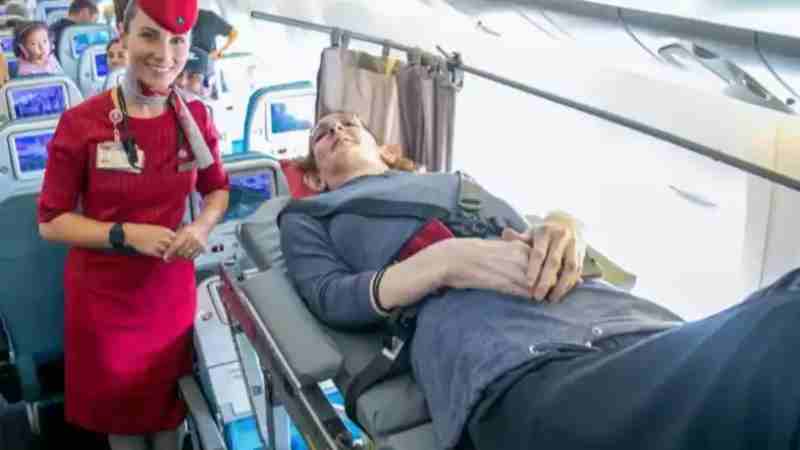 Ya, wanita yang juga seorang pengacara dan web developer itu tidak duduk di kursi melainkan tidur di tandu khusus dengan seat belt yang juga didesain khusus selama penerbangan.
