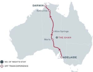 Perjalanan ini memiliki durasi sekitar 24 jam. Anda akan melewati wilayah-wilayah yang berbeda, termasuk dataran rendah, pegunungan, gurun, dan kawasan pedalaman Australia Tengah. Perhentian penting dalam perjalanan ini adalah Alice Springs, yang terkenal dengan keindahan alam gurun dan budaya Aborigin.