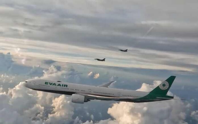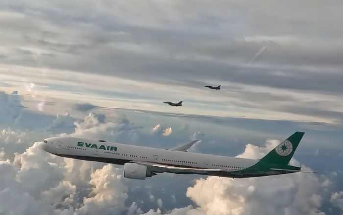 F-16 lepas landas untuk menyambut pesawat Boeing 777-300ER (Extended Range) di udara sebelum mendarat di Bandara Internasional Taoyuan (TPE). Jet-jet tersebut melepaskan suar saat mengawal penerbangan tersebut.
