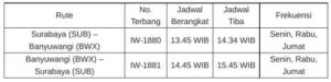 Penerbangan singkat Banyuwangi-Surabaya dilayani pesawat turboprop ATR 72-600 (kapsitas 72 kursi kelas ekonomi), dan berikut di bawah ini adalah jadwal penerbangan yang dirilis Wings Air dalam siaran pers.