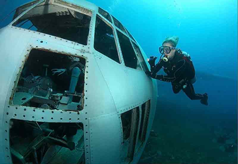 Pesawat tidak melulu indah saat di langit. Di bawah laut pun, pesawat (bangkai pesawat) juga demikian meskipun dilihat dari sudut pandanga yang berbeda, salah satunya sebagai terumbu karang dan spot favorit menyelam.